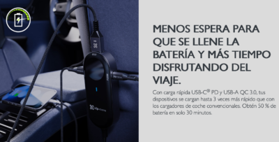Este cargador incluye puertos USB-C y USB-A, permitiendo cargar múltiples dispositivos simultáneamente desde el encendedor del vehículo. El puerto USB-C con Power Delivery ofrece una carga más rápida para dispositivos modernos, mejorando la eficiencia durante viajes o trayectos diarios.