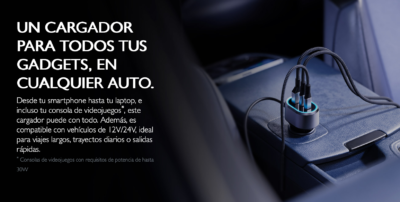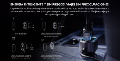 Su diseño compacto y resistente permite conectarlo fácilmente al puerto de energía del automóvil sin ocupar mucho espacio. Además, cuenta con sistemas de protección contra sobrecarga, sobrecalentamiento y cortocircuitos, asegurando una carga segura para todos tus dispositivos.