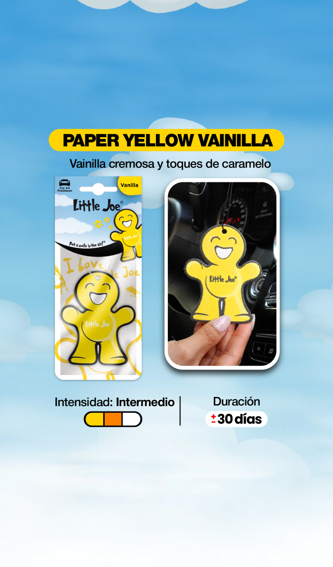 La Little Joe® Paper Vainilla es la alternativa ideal al clip de ventilación. Déjala colgar de tu espejo retrovisor y disfruta de su aroma dulce y acogedor 🍃🚗.
